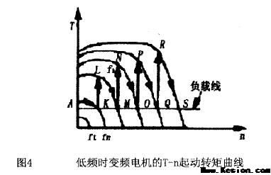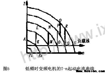 為了有利低頻起動現(xiàn)象研究分析,可以把電機低頻時的起動轉(zhuǎn)矩、以及起動電流的曲線圖畫出,見圖4、圖5。變頻電機是通過一個曲線族形成起動過程的,它的變化過程是一個沿著A、K、L、M、N、0、P、Q、R、s折線而表現(xiàn)為鋸齒形的曲線。