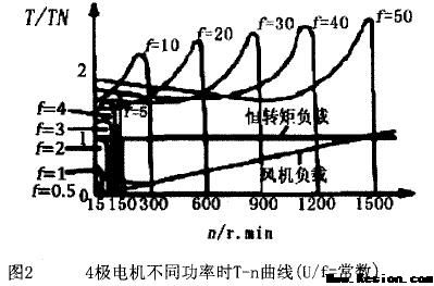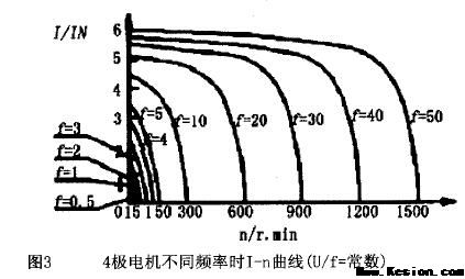 電機在起動的過程中,頻率和電壓都在同時增大,從低頻開始起動是必然要求。不同條件下頻率、電壓T—n曲線表現(xiàn)各異,電壓、頻率依次增加,不同電壓和頻率相對應(yīng)的I—n曲線族,見圖2、圖3。