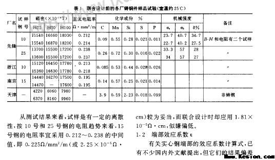聯(lián)合設(shè)計前,先鋒廠曾對各廠提供的鑄鋼件試樣進行B-H曲線、直流電阻和化學(xué)成份的檢驗,其結(jié)果如表1所示。